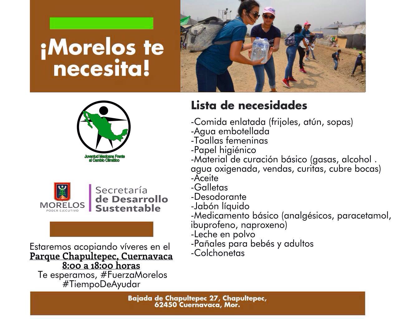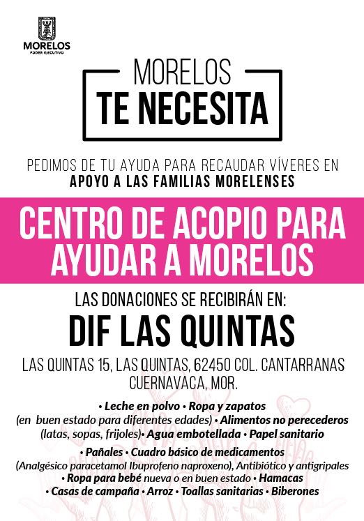 En el estado de Morelos, el centro de acopio está instalado en el DIF estatal ubicado en Las Quintas 15, colonia Cantarranas, en Cuernavaca, donde se recibe: Leche en polvo, ropa y zapatos (incluso para bebé), alimentos no perecederos, agua embotellada, papel sanitario, pañales, cuadro básico de medicamentos, toallas sanitarias, biberones y casas de campaña.