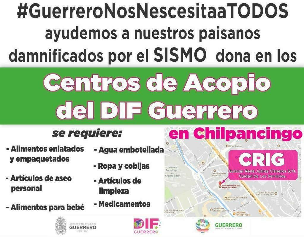 En el estado de Guerrero, se puede apoyar a los damnificados por el sismo en los centros de acopio del DIF Guerrero.