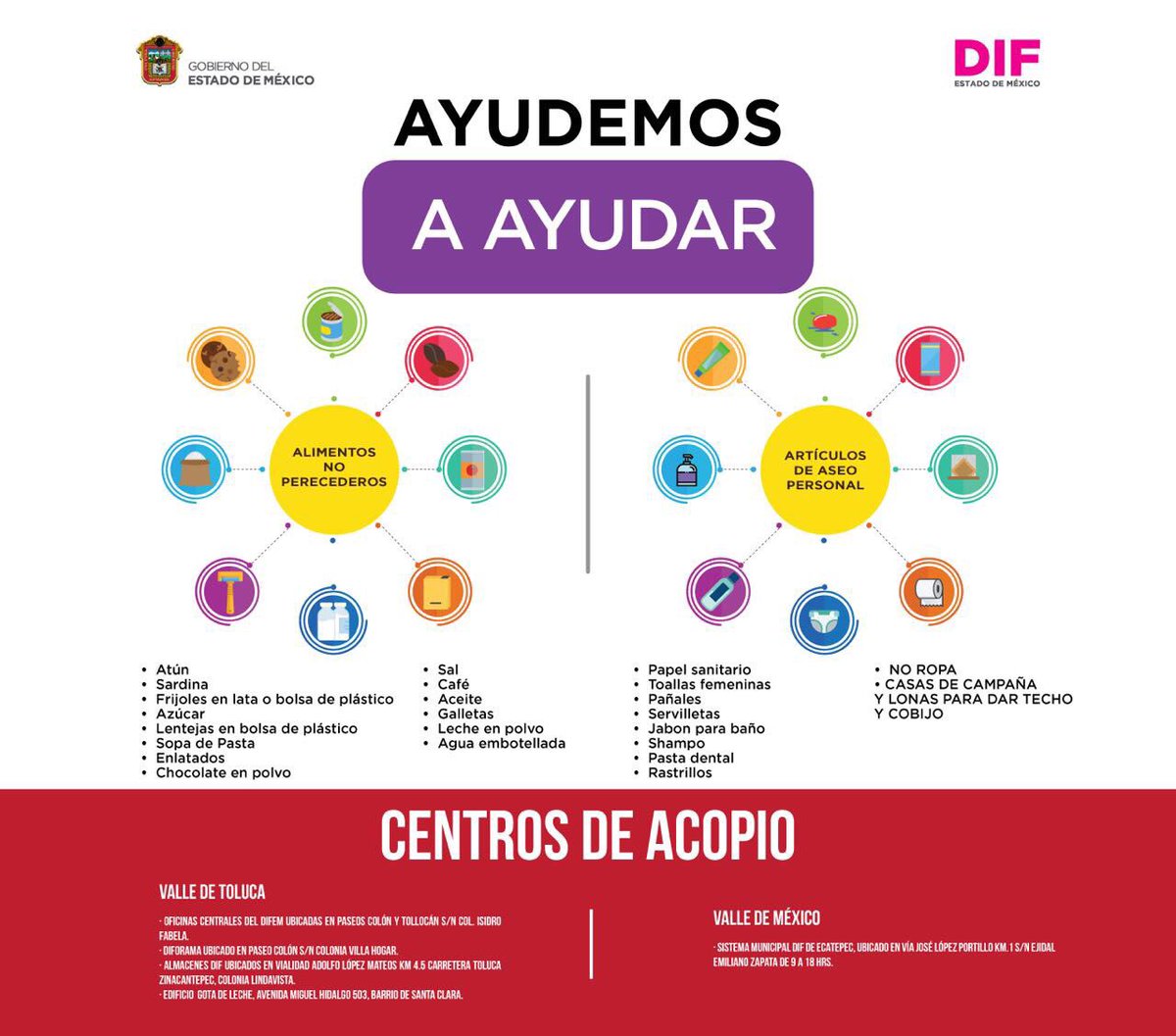 - En el Valle de México también se reciben víveres en el Sistema Municipal DIF de Ecatepec, ubicado en Vía José López Portillo kilómetro 1 s/n Ejidal Emiliano Zapata.