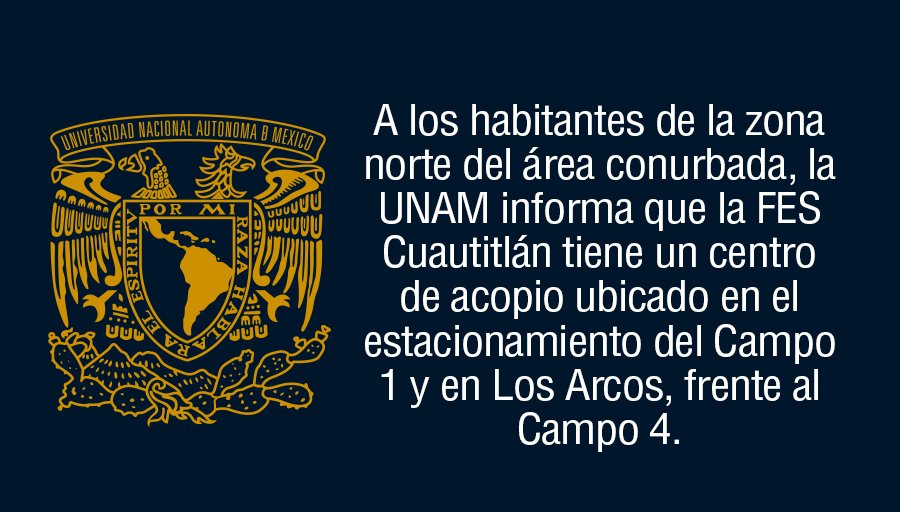 La Universidad Autónoma del Estado de México también instaló centros de acopio en las facultades de Medicina, Antropología, Economía, Ciencias Políticas y Sociales, Odontología, Humanidades y Ciencias Agrícolas; en las prepas 2,3,4 y 5; así como en CU Ecatepec, CU Valle de Chalco, UAP Cuautitlán Izcalli, UAP Chimalhuacán, Estadio Universitario Alberto “Chivo# Córdova, Estadio “Lic. Juan Josafat Pichardo Cruz” y en Uni Radio 99.7