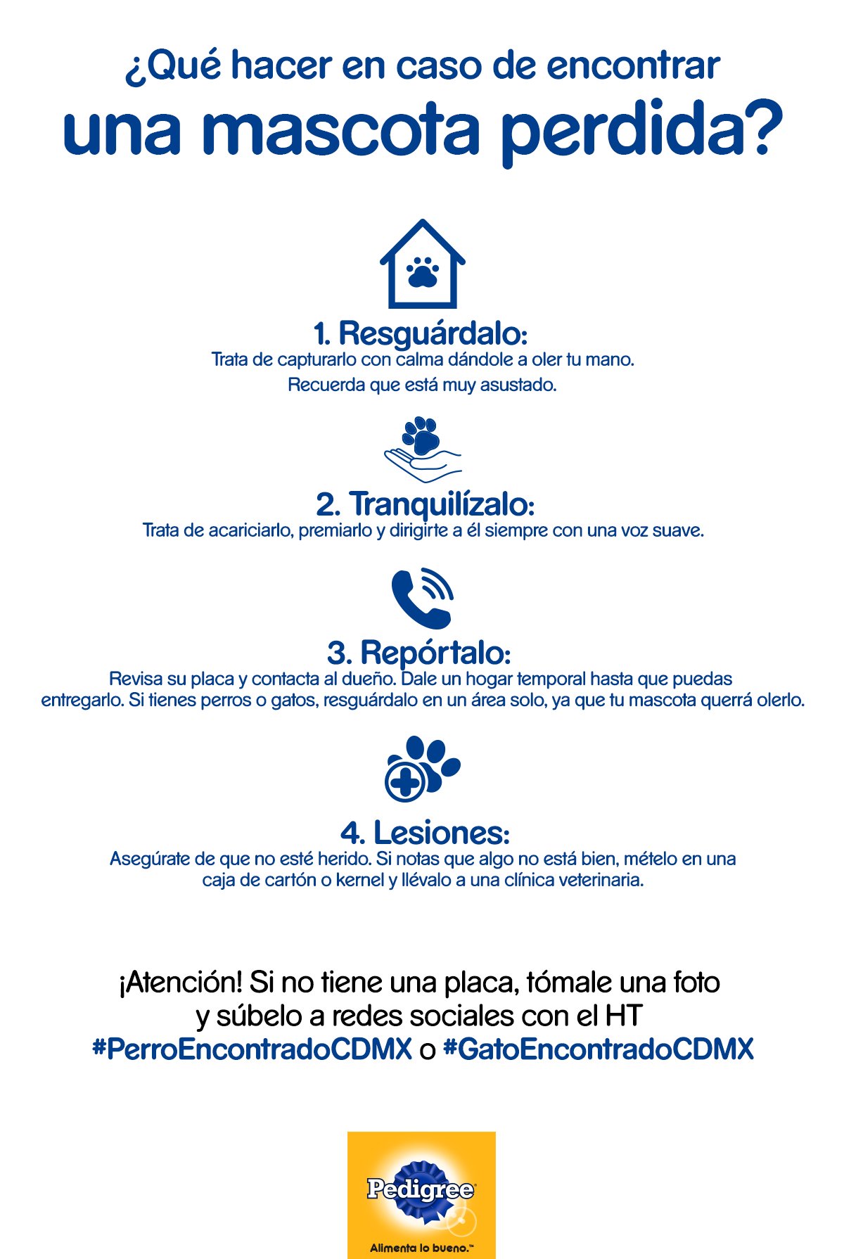 Pedigree México exhorta a quienes encuentren una mascota perdida, resguardarlo, tranquilizarlo, reportarlo, llevarlo a una clínica veterinaria si presenta lesiones; y en caso de que no tenga placa, tomarle una foto y subir en redes sociales con el HT #PerroEncontradoCDMX o #GatoEncontradoCDMX